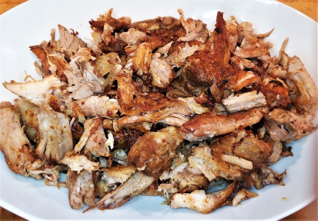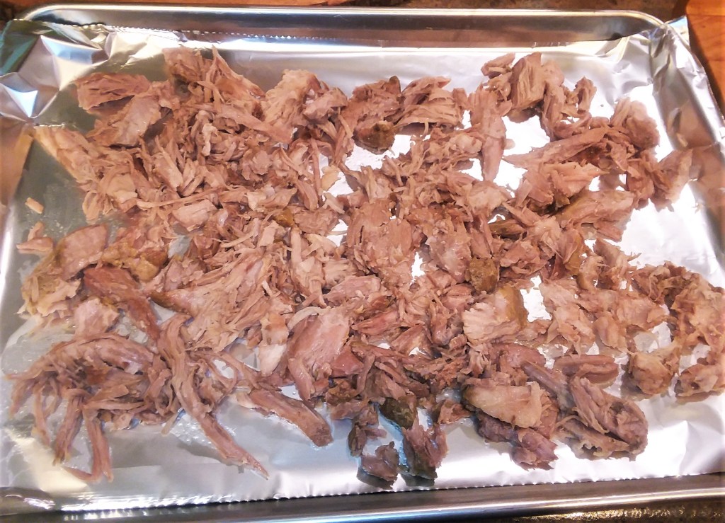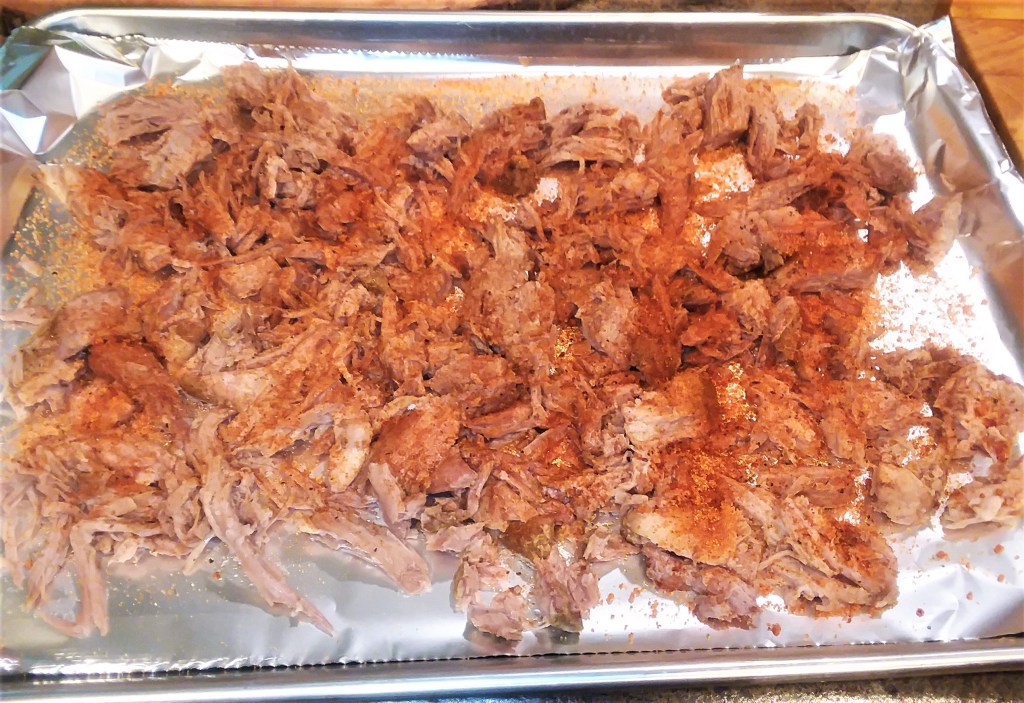 The pork was fall-apart tender, so we shredded it out on a foil-lined baking sheet, topped it with a sprinkle of Honey-based BBQ seasoning. I like Kosmo Q’s ‘Killer Honey Bee’ but you can use whatever you wish, or even a sprinkle of brown sugar. This will help the pork crisp a tiny bit as well as add flavor.