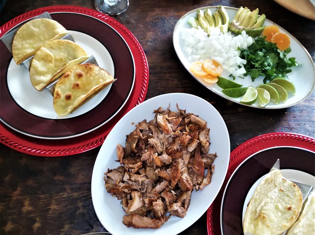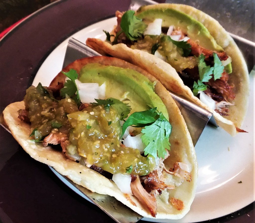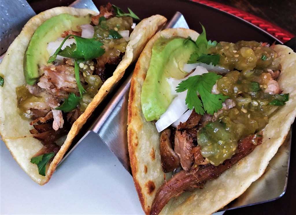 Built up each taco with carnitas pork, a slice of avocado, diced onion, cilantro, salsa verde, and a squeeze of lime. You can use flour-based tacos but corn tacos are the best with this recipe.