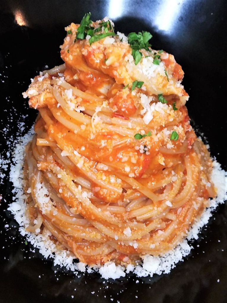 Capellini Pomodoro, made with chicken scraps in the sauce!